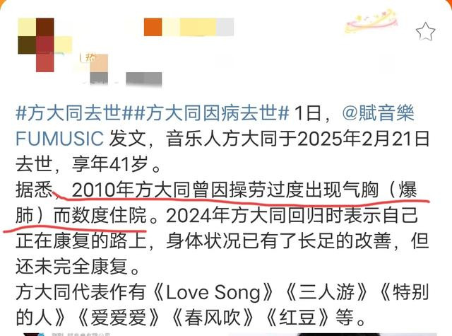 至于原因,网上说是他工作劳累过度,早在十多年前就有气胸状况,近些年一直在努力康复,包括去年还成功复出,身体状况有了很大改善。他的音乐比较前卫,旋律动听,是不可多得的才子。